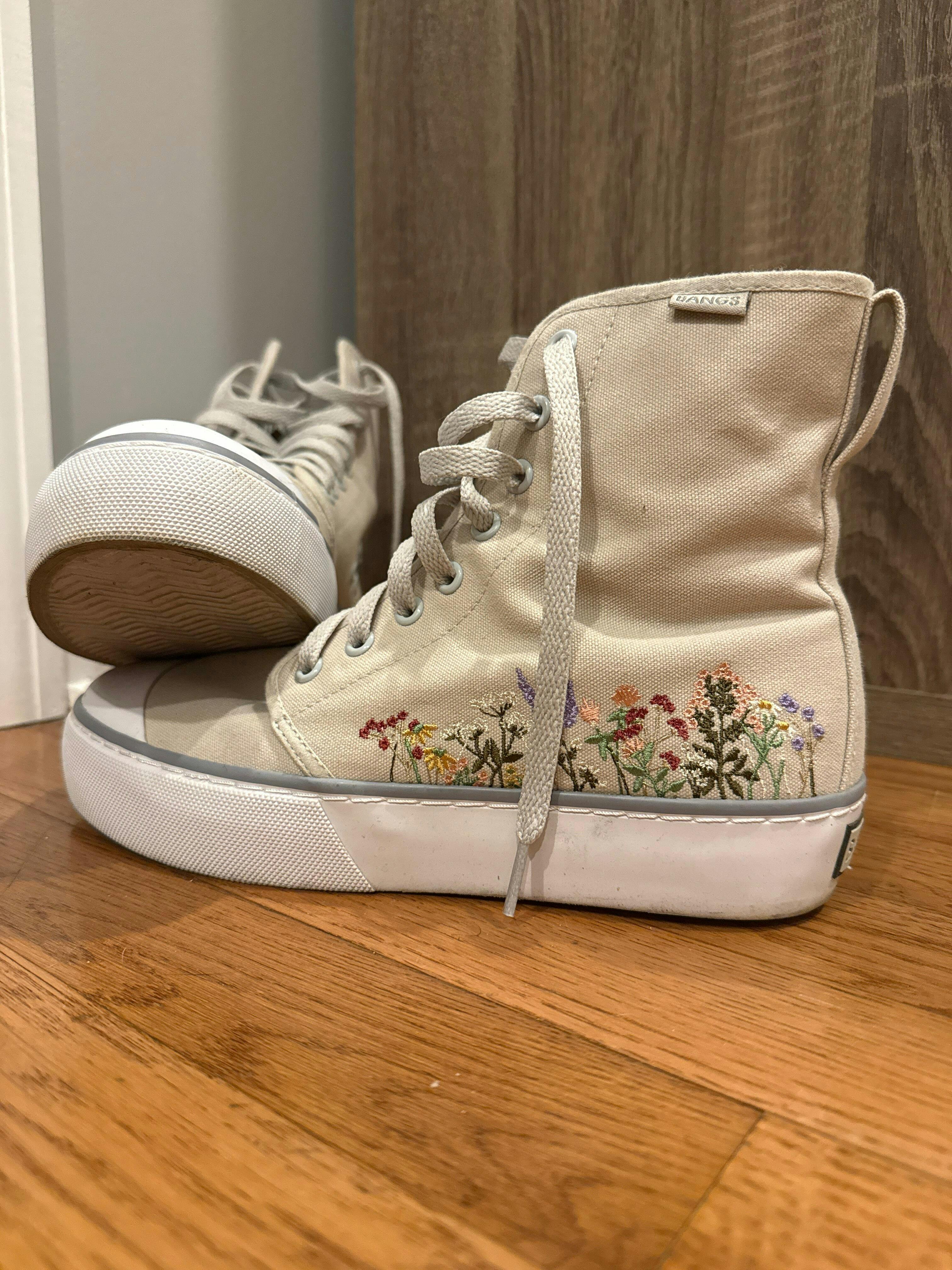 Our Wildflower Wanderer Platform High Tops have beautifully embroidered wildflowers on the outside of both shoes. The sole is 1.5 inches (our normal shoes have 0.9 inch soles) and the high top part around your ankle is ~ 1 inch higher than our normal high tops. This shoe color is our london fog, which is light grey.
