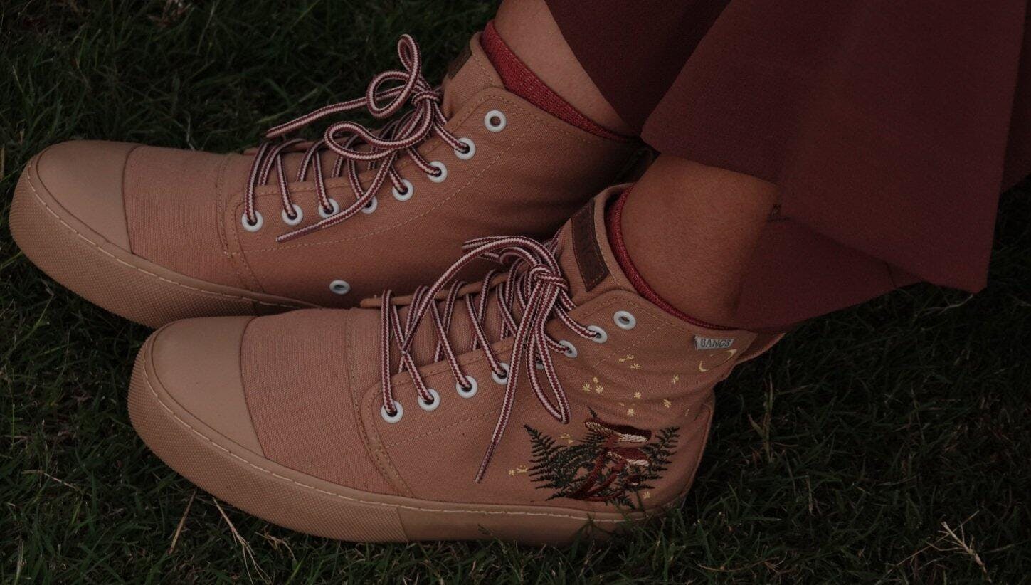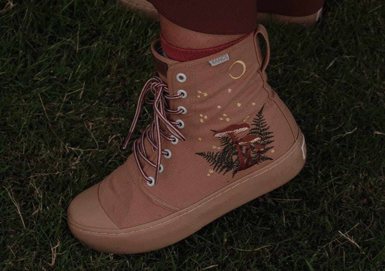 This stunning shoe is a fully embroidered design created in collaboration with Hannah Drapinski. The sole is 1.5 inches (our normal shoes have 0.9 inch soles) and the high top part around your ankle is ~ 1 inch higher than our normal high tops. This canvas is our Zion Sand khaki color.