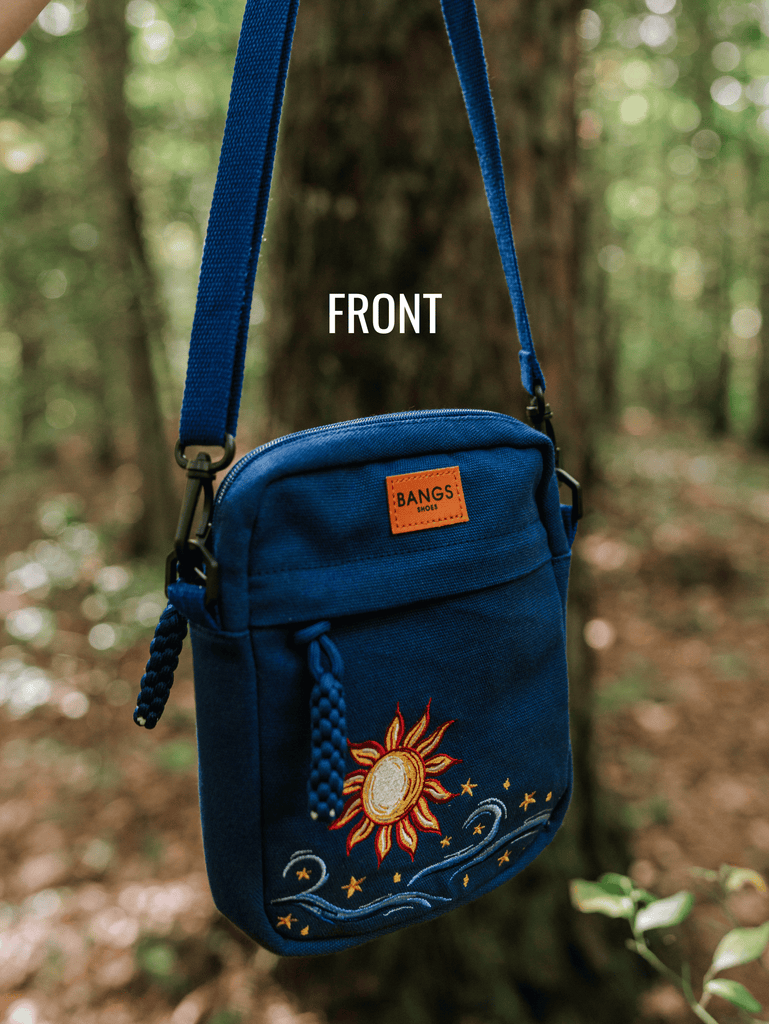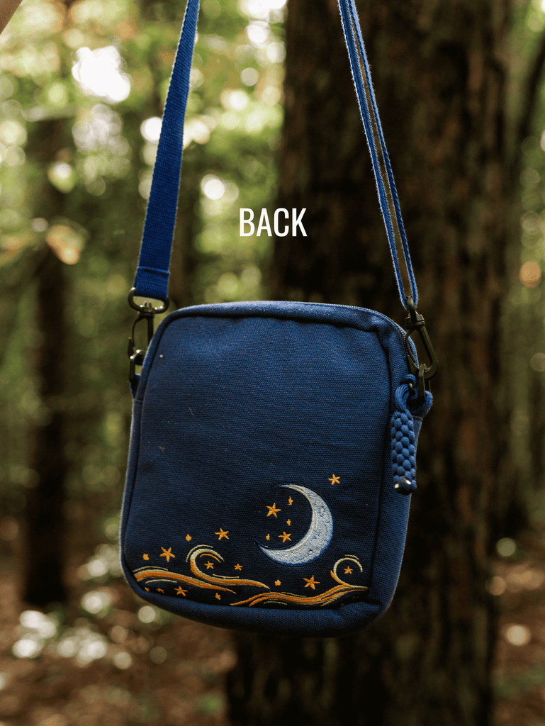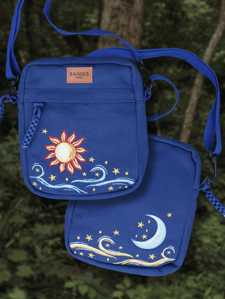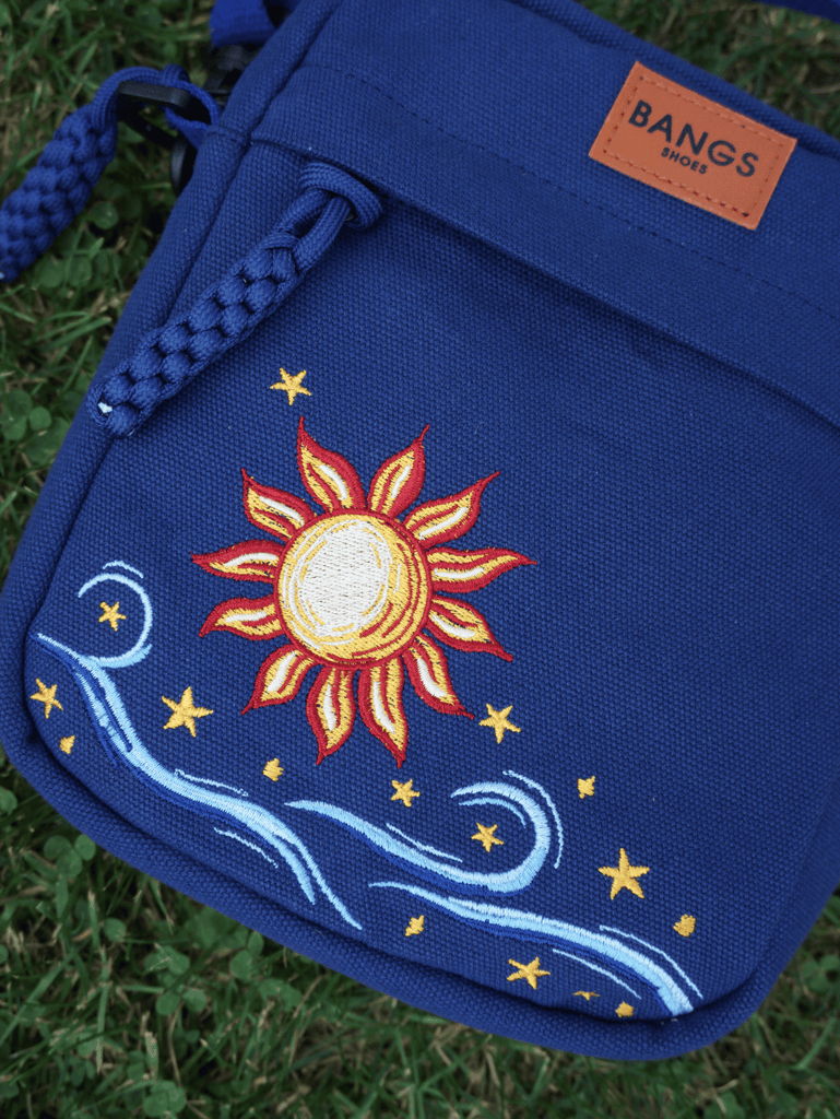 Carry a little day and night with you, wherever you roam. This sturdy blue canvas bag features a fully embroidered sun design on the front and a glowing moon on the back, a perfect balance of light and dark. Inside, a striped lining adds a playful surprise that makes even the smallest details feel special.