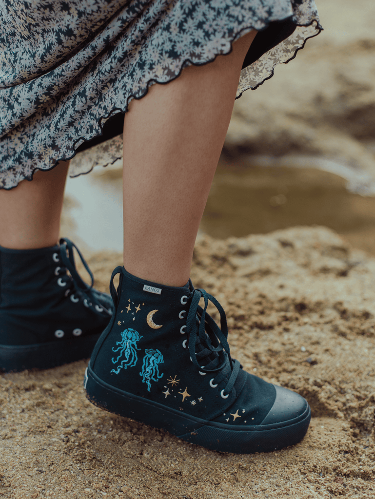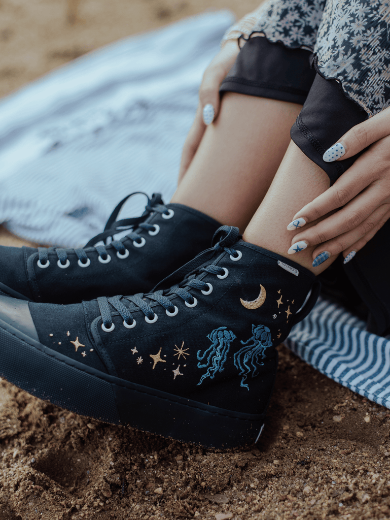 Moonjelly Magic Platforms bring the ocean’s glow to every step. Crafted from dark navy canvas with a memory foam sole, each pair features a fully embroidered jellyfish scene.