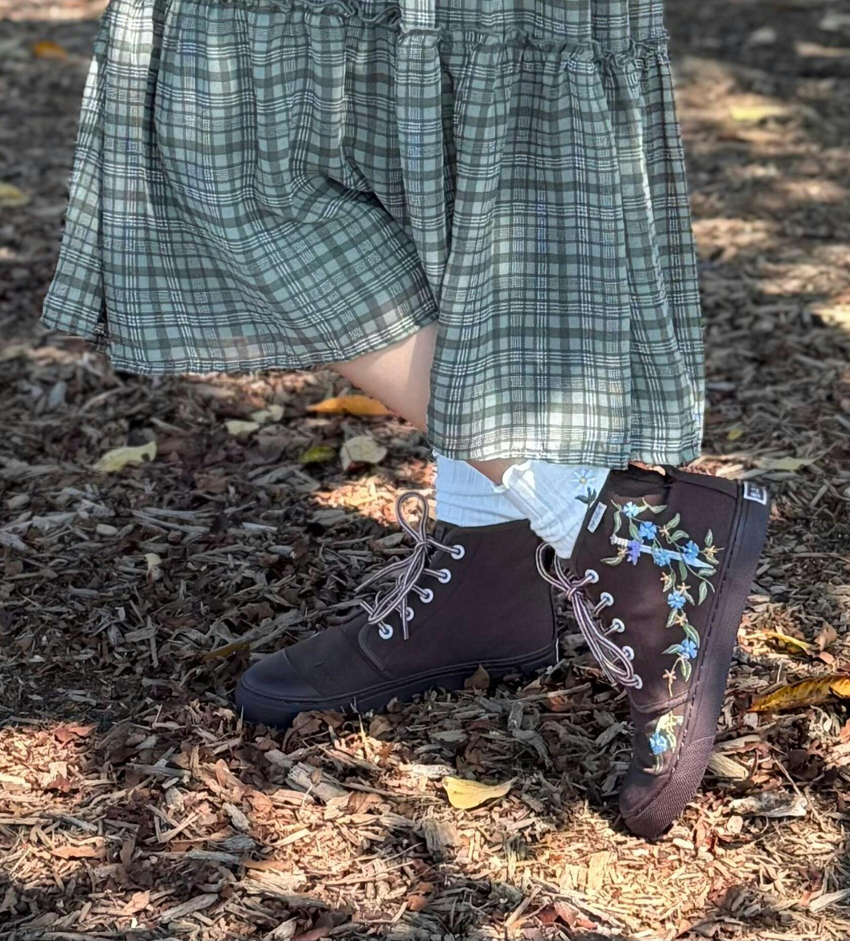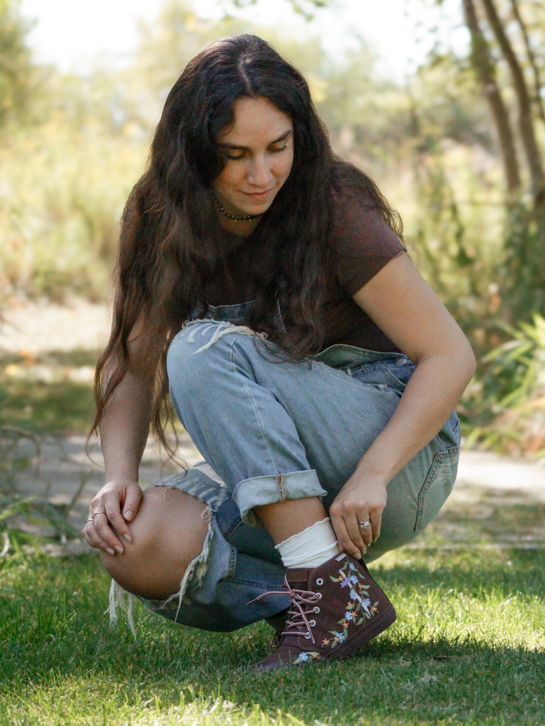 Floral & Fable High Tops feature an embroidered sword entwined with wildflowers. A rich dark brown canvas sets the stage as vibrant blooms climb across each side, made for wanderers who create stories with every step. Lace them up and let yours unfold.