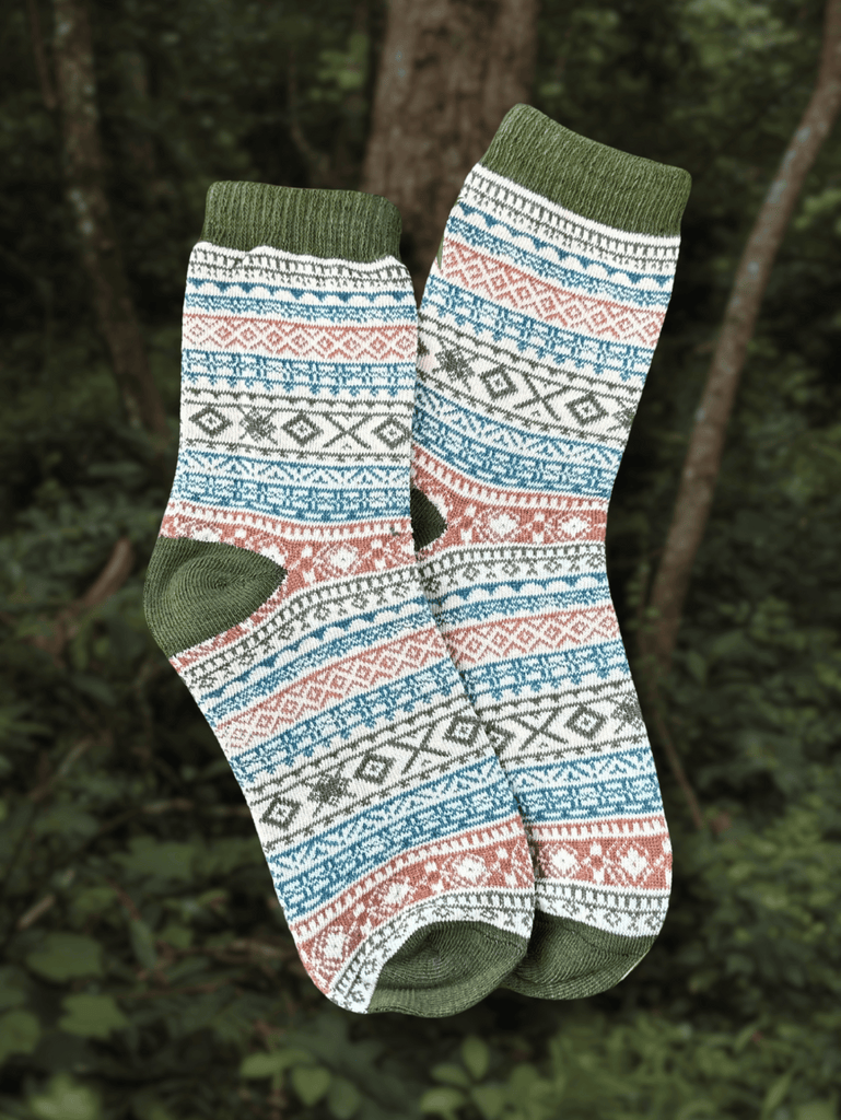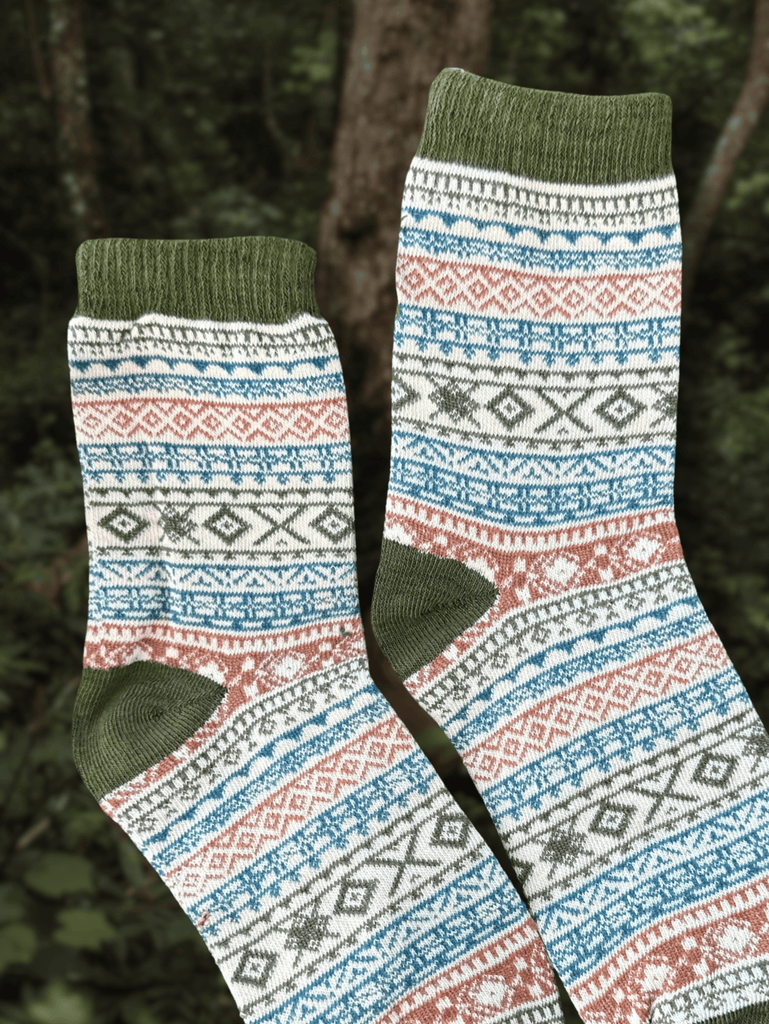 One size fits most. Built for cozy days, our Nordic Moss Socks blend earthy green tones with a timeless pattern that feels both fresh and classic. Crafted from a soft cotton blend, they’re made to keep up with every step.