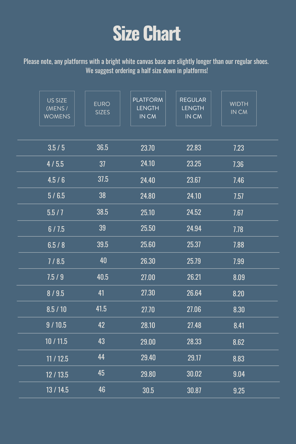 If you're ordering high tops, low tops, slip ons, or platforms that are NOT made from white canvas, order the size you wear the most.